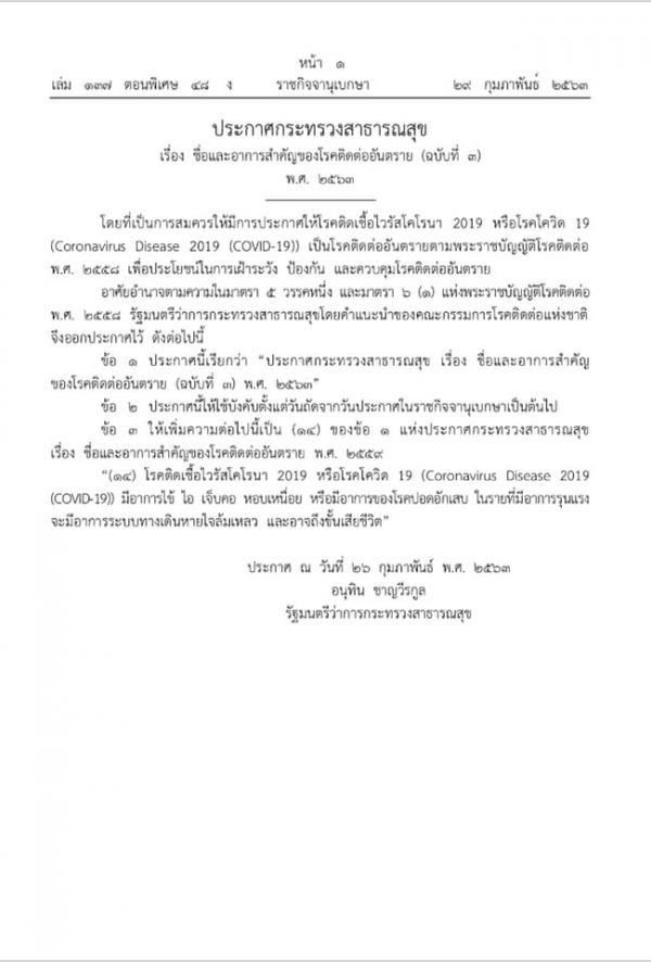 รูปภาพหัวข้อข่าว : ประกาศกระทรวงสาธารณสุข เรื่อง ชื่อและอาการสำคัญของโรคติดต่ออันตราย (COVID-19)