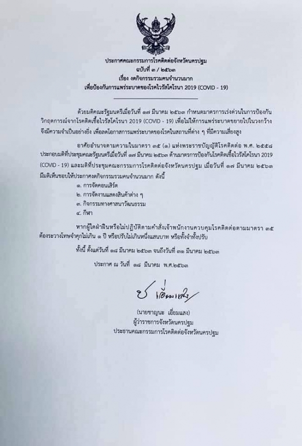 รูปภาพหัวข้อข่าว : ประกาศคณะกรรมการโรคติดต่อจังหวัดนครปฐม เรื่อง งดกิจกรรมรวมคนจำนวนมาก เพื่อป้องกันการแพร่ระบาดของโรคไวรัสโคโรนา 2019 (COVID - 19)
