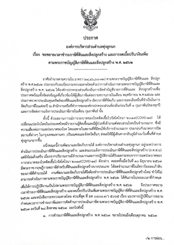 รูปภาพหัวข้อข่าว : ขยายเวลาชำระภาษีที่ดินและสิ่งปลูกสร้าง และการงดเบี้ยปรับ/เงินเพิ่มตามพระราชบัญญัติภาษีที่ดินและสิ่งปลูกสร้าง พ.ศ. 2562