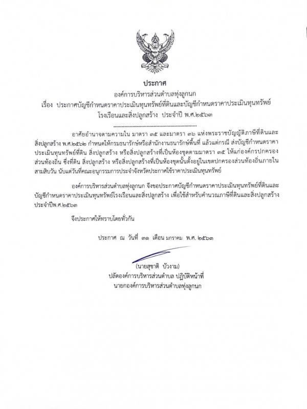 รูปภาพหัวข้อข่าว : ประกาศ บัญชีกำหนดราคาประเมินทุนทรัพย์ที่ดินและบัญชีกำหนดราคาประเมินทุนทรัพย์โรงเรือนและสิ่งปลูกสร้าง ประจำปี พ.ศ.2563
