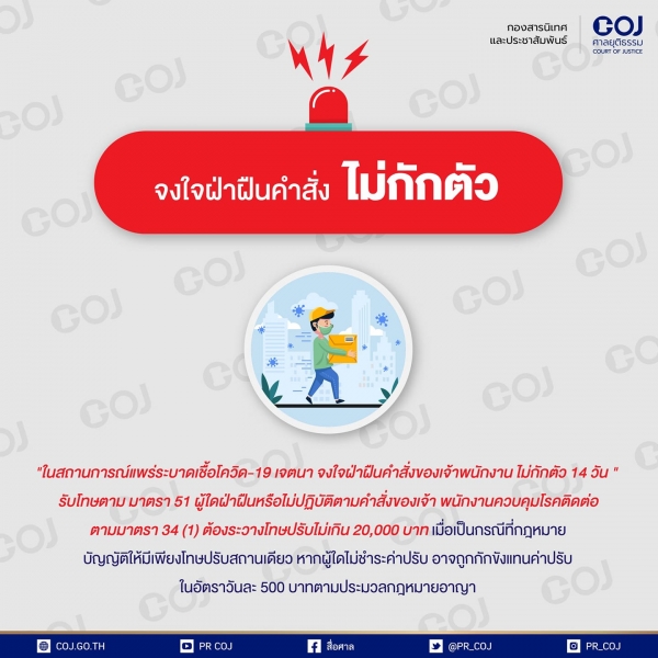รูปภาพหัวข้อข่าว : "ในสถานการณ์แพร่ระบาดเชื้อโควิด-19 ผู้ใดเจตนา จงใจฝ่าฝืนคำสั่งของเจ้าพนักงาน ไม่กักตัว 14 วัน "