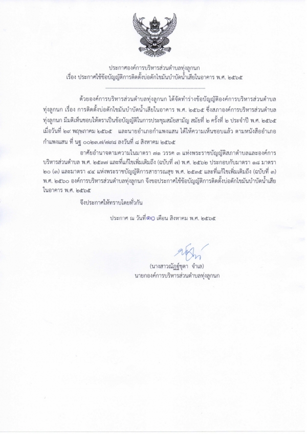 รูปภาพหัวข้อข่าว : ประกาศองค์การบริหารส่วนตำบลทุ่งลูกนก เรื่อง ประกาศใช้ข้อบัญญัติการติดตั้งบ่อดักไขมันบำบัดน้ำเสียในอาคาร พ.ศ. 2565 และข้อบัญญัติองค์การบริหารส่วนตำบลทุ่งลูกนก เรื่อง การติดตั้งบ่อดักไขมันบำบัดน้ำเสียในอาคาร พ.ศ. 2565