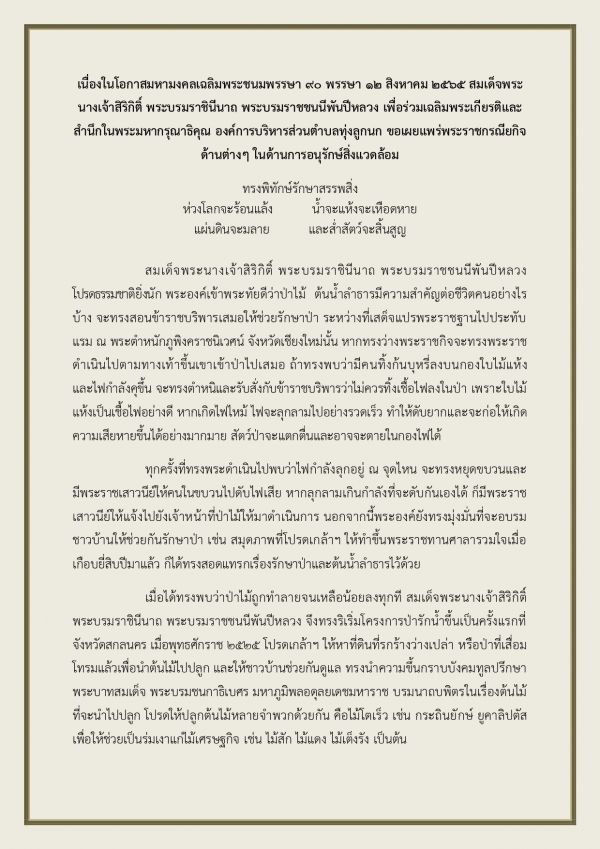 รูปภาพหัวข้อข่าว : เนื่องในโอกาสมหามงคลเฉลิมพระชนมพรรษา ๙๐ พรรษา ๑๒ สิงหาคม ๒๕๖๕ สมเด็จพระนางเจ้าสิริกิติ์ พระบรมราชินีนาถ พระบรมราชชนนีพันปีหลวง เพื่อร่วมเฉลิมพระเกียรติและสำนึกในพระมหากรุณาธิคุณ องค์การบริหารส่วนตำบลทุ่งลูกนก ขอเผยแพร่พระราชกรณียกิจด้านต่าง ๆ