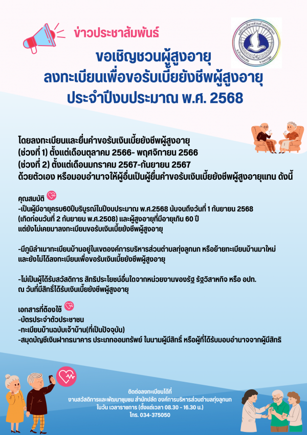 รูปภาพหัวข้อข่าว : ประชาสัมพันธ์ องค์การบริหารส่วนตำบลทุ่งลูกนก ขอเชิญชวนผู้สูงอายุ ลงทะเบียนเพื่อขอรับเบี้ยยังชีพผู้สูงอายุ ประจำปีงบประมาณ พ.ศ. 2568