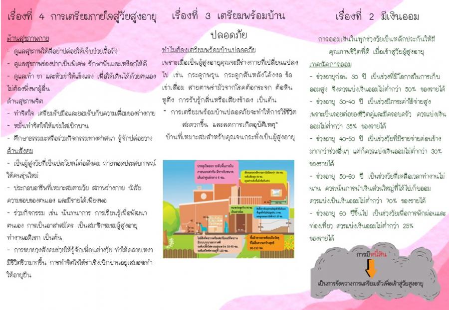 ได้ดำเนินการจัดทำข้อมูลที่เป็นประโยชน์ต่อผู้สูงอายุ ด้านการเตรียมความพร้อมของประชาชนเพื่อวัยสูงอายุ เพื่อให้ผู้สูงอายุได้ตระหนักถึงความจำเป็นของการเตรียมการเป็นผู้สูงอายุ ประจำปีงบประมาณ พ.ศ. 2567 เรื่อง “เตรียมความพร้อมไม่ต้องเดี๋ยว...เผลอแป๊บเดียวก็สูงวัย” เพื่อเผยแพร่ให้ผู้สูงอายุได้รับทราบข้อมูล